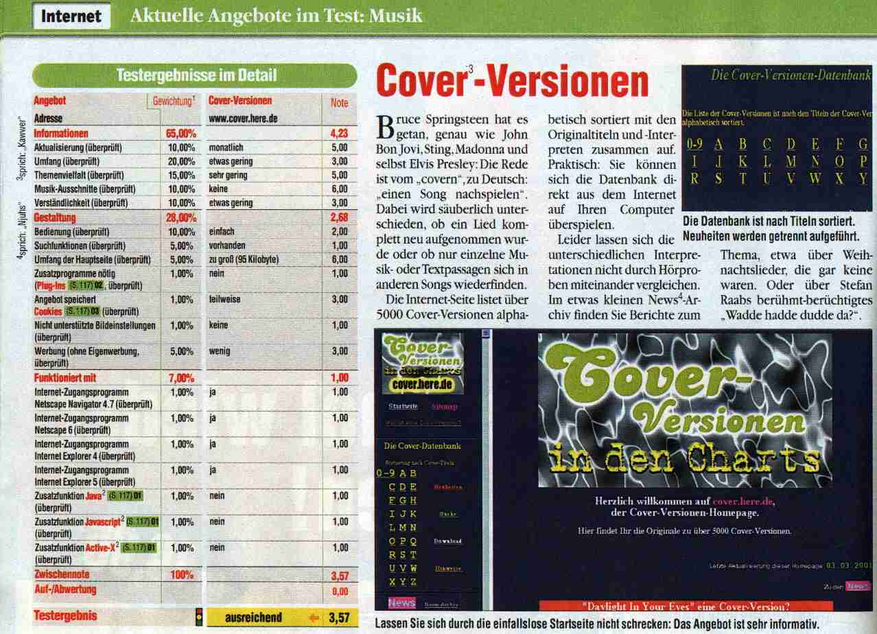 In der Liste der "besten Internet-Angebote" (S. 136 f.) in der Kategorie Musik landet cover.here.de in der COMPUTERBILD 8/2001 immerhin auf Platz 32!